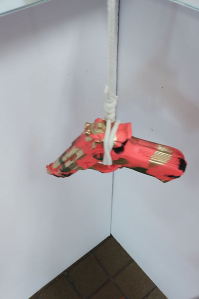 In Solidarity, a circle of camouflaged guns takes aim at a single, brightly colored gun suspended in the center. With its barrel drooping like a noose, this gun, 'the Other' is marked for elimination. The installation reflects how conformity dominates, and how visible difference becomes a target.